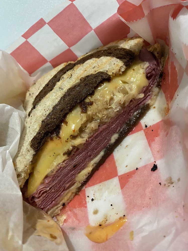 Premium Corned beef, sauerkraut, baby Swiss and thousand Island dressing on marble rye. Includes Chips & a Pickle