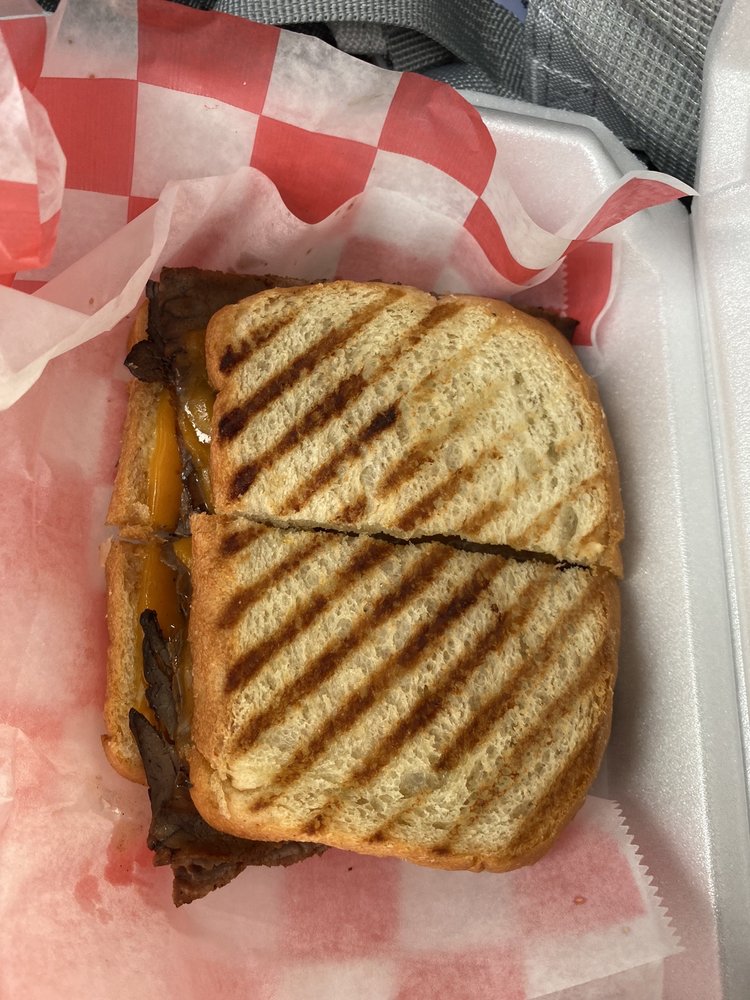 Grilled cheese loaded with buffalo wing chicken and cheese. Served with a cup of ranch for dunking. Includes chips and a pickle.